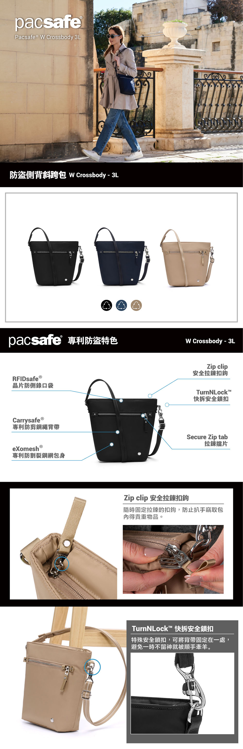 W系列設計簡潔輕巧,是專門為都市女伶所打造; 3L 防盜側背托特包,經典時尚大容量也不忘提供額外保護,確保手機和錢包等重要物品的安全。 這款背包還採用防割裂鋼網包身和防剪背帶、安全鎖扣拉鍊和 RFID 防射頻口袋,包身以再生PET製成,還能同時為地球減少一些負擔。
