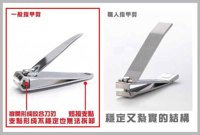 一般指甲剪因工藝限制, 支點的形成不能帶來使用時穩定的安定感 。僅能在成型後打磨外緣刀刃,