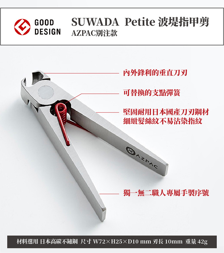 AZPAC行李箱品牌與SUWADA職人指甲剪的跨界聯名,Petite波堤指甲剪由經典鉗形指甲剪結合木製曬衣夾的設計,讓外觀看起來精緻可愛易於掌握,也弱化了原本鉗形刀刃鋒利的印象。搭配的是AZPAC訂製款植鞣皮革收納套,有溫度般的細緻麂皮手感,可合身收納波堤指甲剪,外出攜帶時收於行李中更便利。