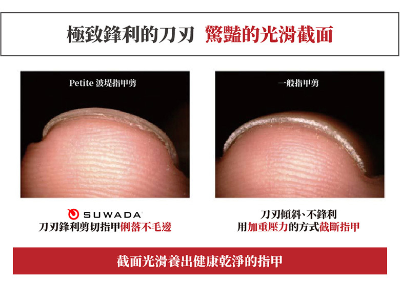 一般指甲剪刀刃易損耗,剪指甲時不僅會飛濺,也容易造成毛刺或斷裂。有機會形成甲溝發炎,急性甲溝炎發作時,整根手指又紅又腫,很多時候跟剪指甲有很大的關係。鋒利刀刃輕鬆將指甲邊緣利角修圓,增強指甲厚度、降低意外折斷的機率,防止指甲往內生長,養出漂亮又乾淨的指甲。