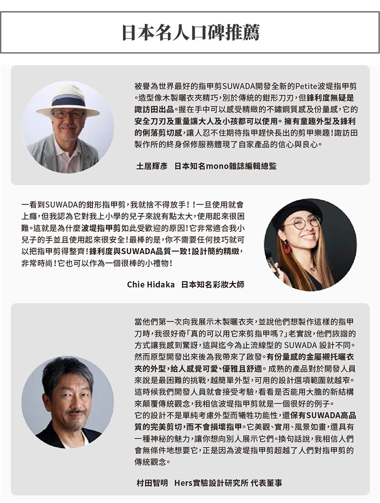 日本名人如福山雅治和木村拓哉都是愛用者!木村拓哉在採訪介紹私下用品推薦表示:說到指甲剪的話那就只有SUWADA了。