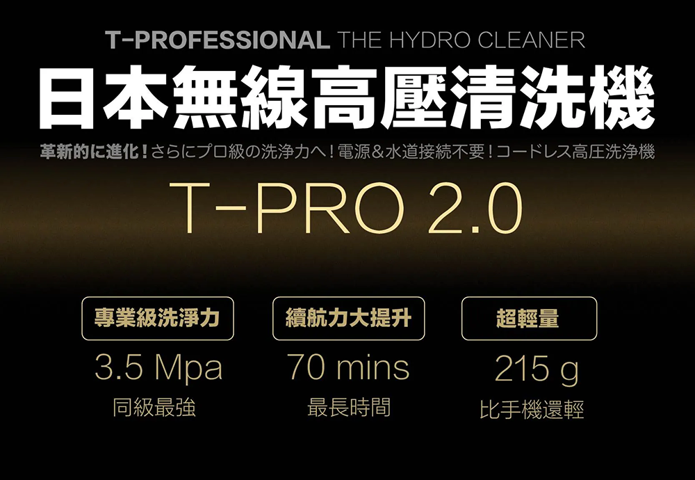 市面上同級最輕量的無線高壓清洗機!T-PRO 2.0 第二代將產品再輕量化,僅215g的重量比手機還輕!