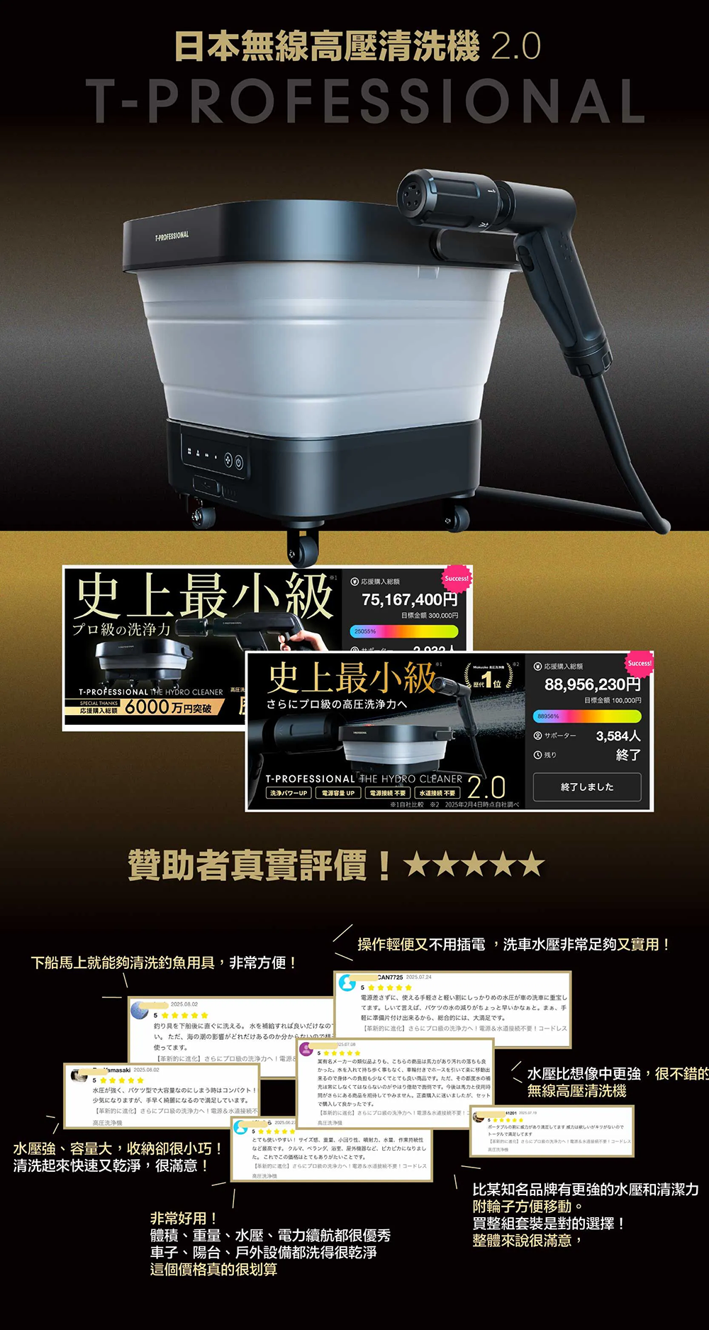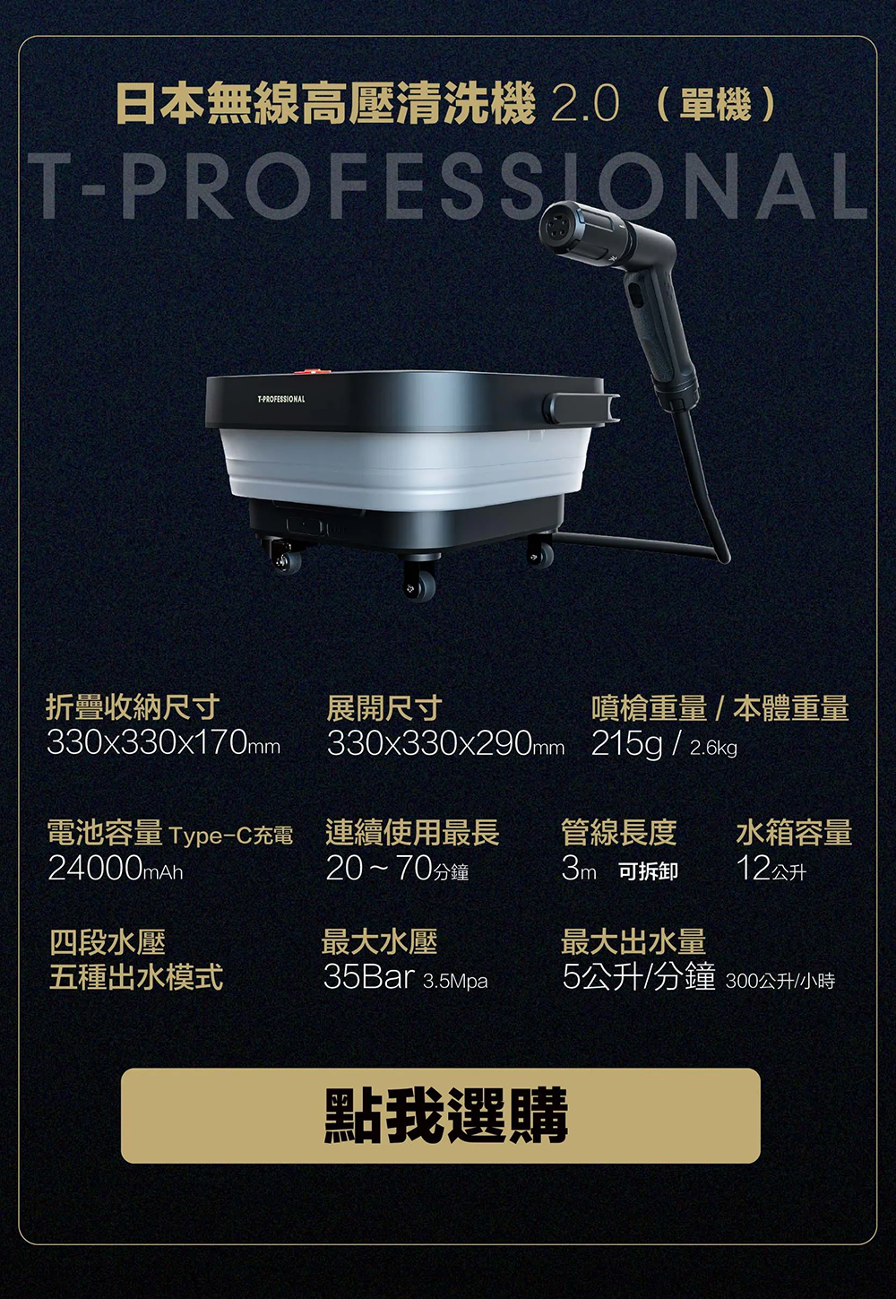 顛覆你對過往無線產品的印象!T-PRO 2.0不需連接電源就能提供3.5Mpa 專業級強力水壓洗淨力(市面同級最強!)隨手就能清洗汽機車表面,保護車漆亮麗如新;輪框泥濘;庭院磁磚青苔縫隙都完全沒問題。