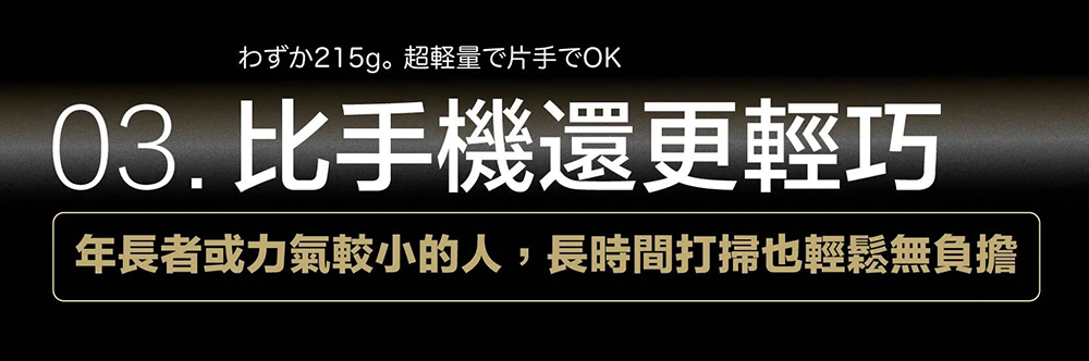 經過仔細考慮過人體工學的握桿設計,減輕長時間打掃時的手部壓力負擔,長輩也能夠很愉快的使用這樣的新科技輔助打掃。