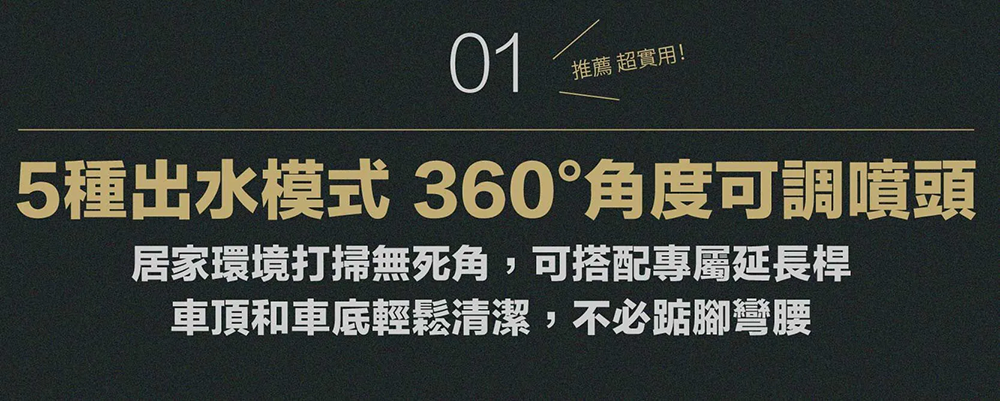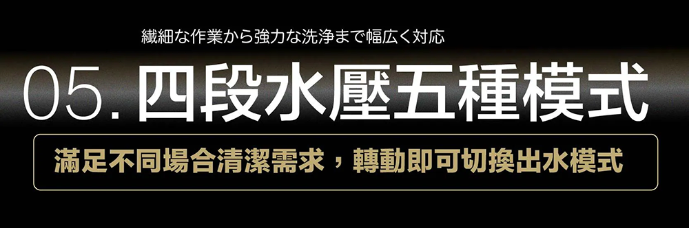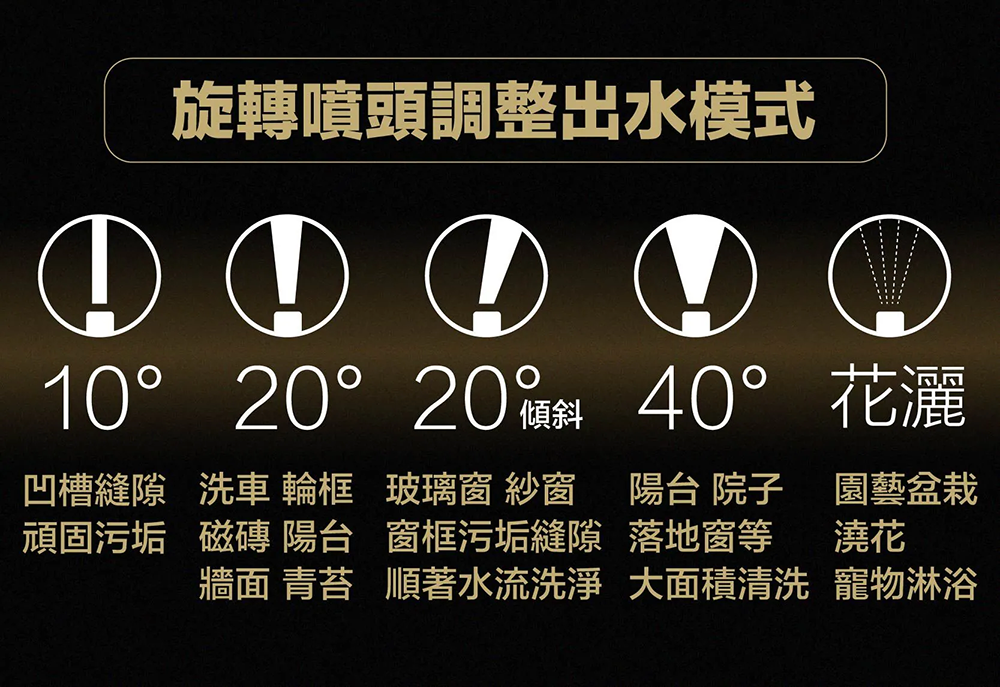 不必更換噴頭,直接旋轉就能調整5種出水模式。集中強力清洗、大範圍清洗,居家或戶外使用,滿足各種清潔需求