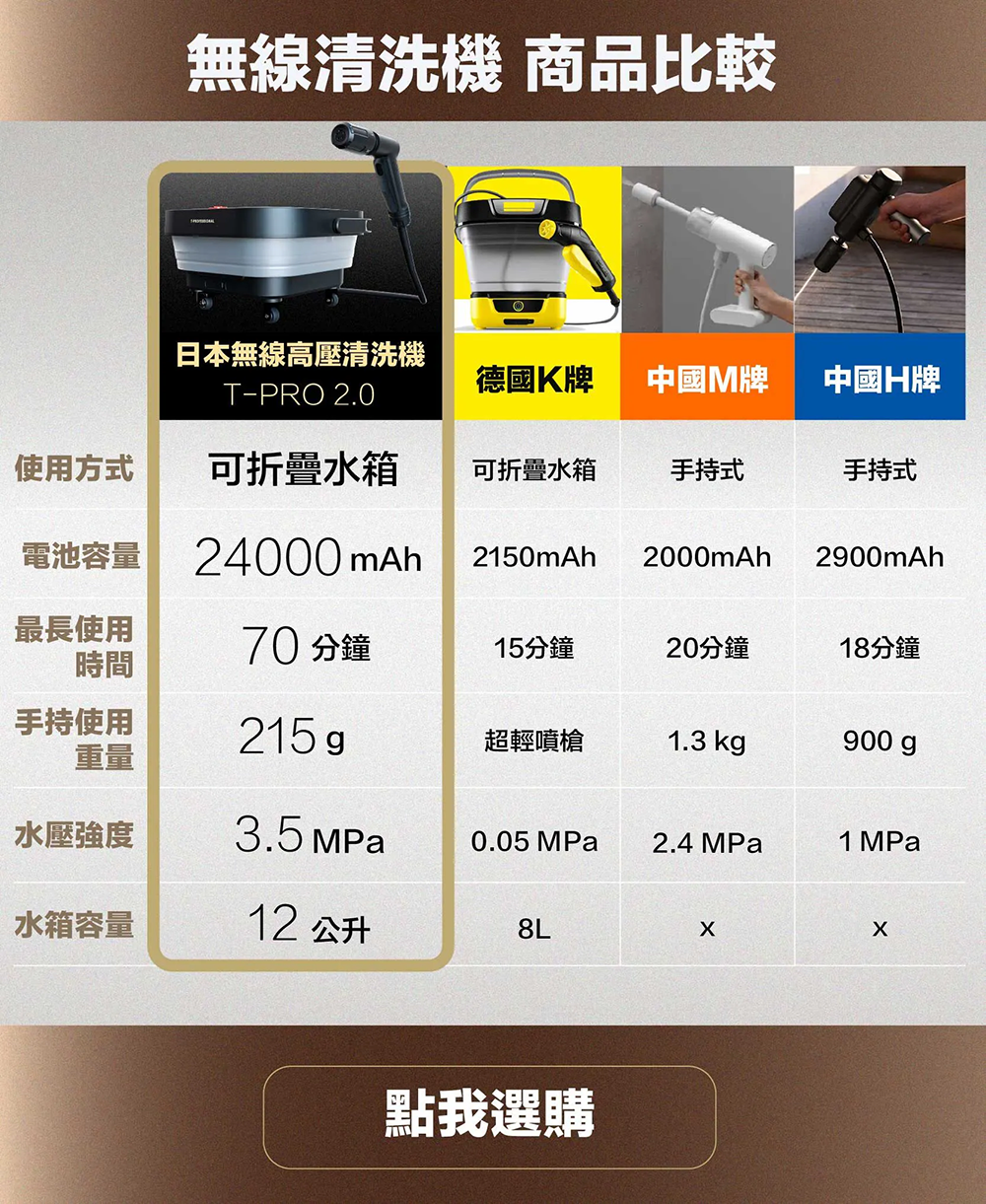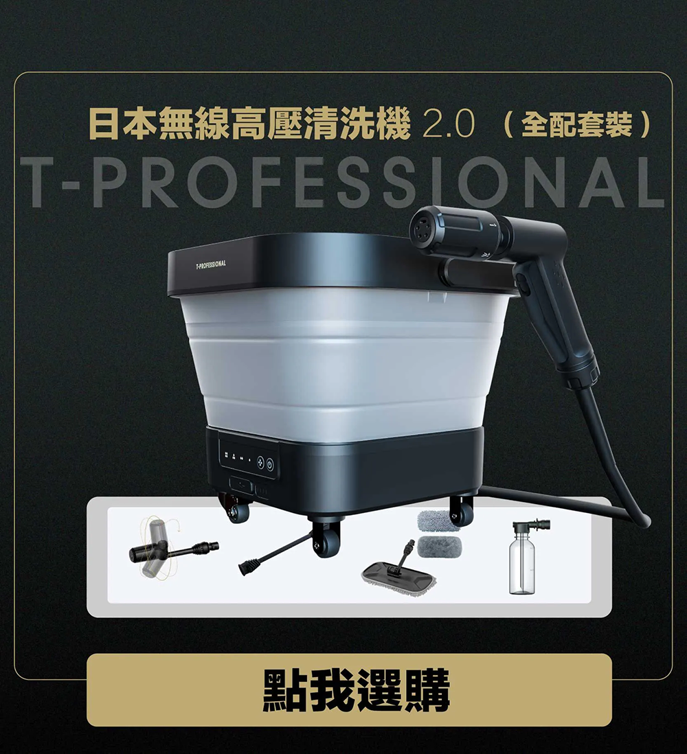T-PRO 2.0則是一款讓你願意每天使用的工具,配件被緊湊收納在折疊的小箱子,隨時提著走就能使用的專業級高壓洗淨力!