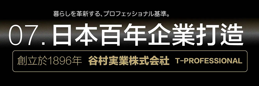 谷村實業株式會社,創立於 1896 年,擁有超過 128 年歷史的日本綜合商社。自家深厚的創新開發力、科技與居家美學融合,為現代美好生活體驗打造高質感商品。旗下品牌 T-PROFESSIONAL 結合專業知識與用戶需求,將可靠性與優雅設計導入日常生活,實現「HAPPY & SURPRISE」的品牌承諾。